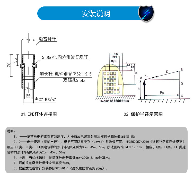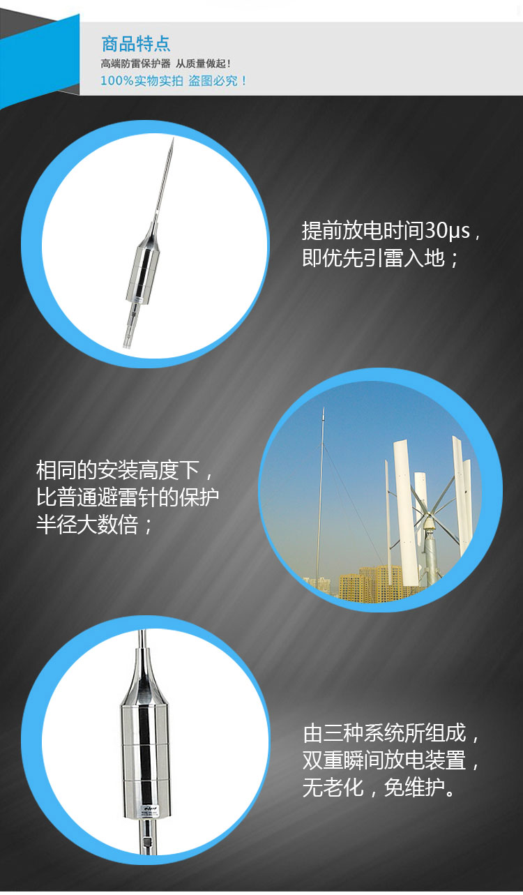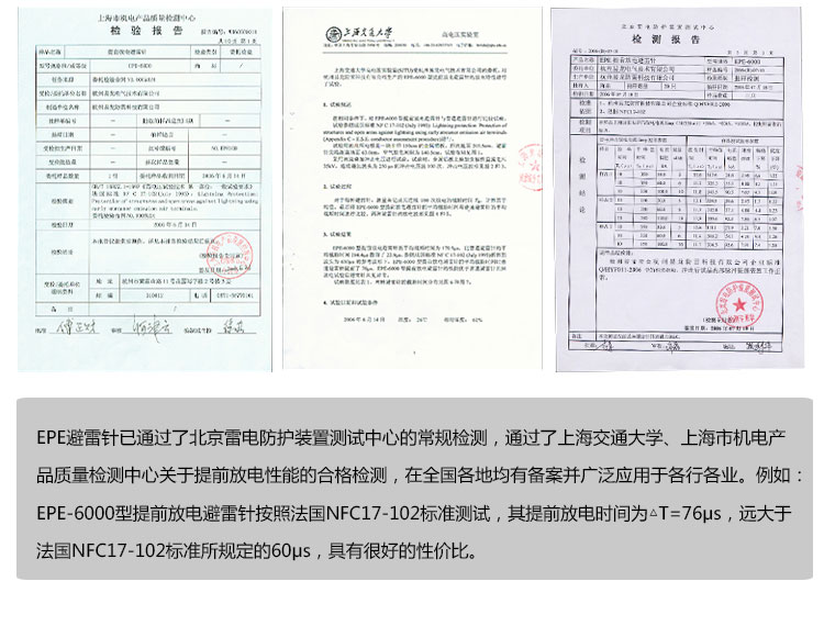 EPE系列提前放電避雷針(以下簡稱EPE避雷針)采用法國技術,符合法國NFC17-102標準。它由三種系統(大氣電力電容器、高壓脈沖發送系統、電流泄放系統)組成,具有雙重瞬間放電裝置,被多層的具有隔絕惡劣環境及水密性的材料所保護;無老化危險,免維護。在相同的安裝高度下,比普通瞬間避雷針的保護半徑大數倍,搶先放電時間為30μs~60μs,即優先引雷入地。