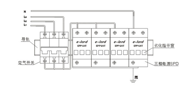1. 已有可靠接地系統(tǒng),在配電柜(避雷器安裝處)的接地樁 條)上進行接地電阻的測定,電阻應(yīng)符合相關(guān)規(guī)范要求。 (或滿足國家、部級標(biāo)準(zhǔn))。 2. 配電柜中應(yīng)留有安裝避雷器的空間, 注:L為電源相線;N為電源零線;PE為地線。 | 應(yīng)檢查空氣開關(guān)已經(jīng)合閘導(dǎo)通,以保證避雷器處于運行狀態(tài); 不要在雷雨天安裝。 |